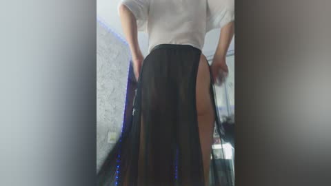 A video of a light-skinned woman with blonde hair, posing provocatively in a dimly lit room with blue LED strip lighting. She is partially undressed, revealing her buttocks and vagina, and wearing black thigh-high stockings.