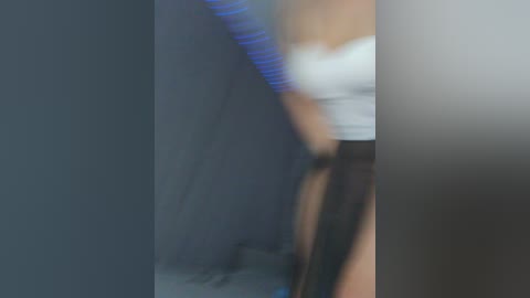 A video of a fair-skinned, blonde woman with a slender physique, wearing a black halter top, exposing her small to medium-sized breasts, and a string of pearls. Background shows a gray wall and a bed.